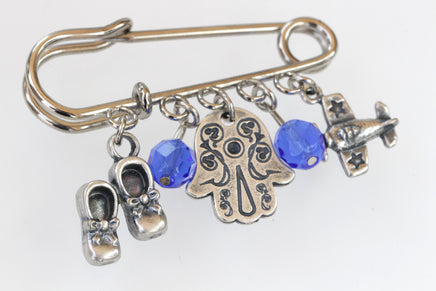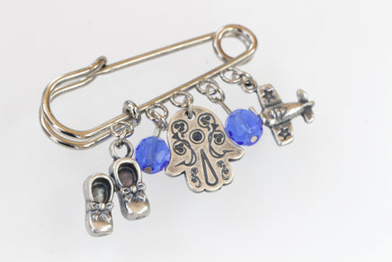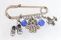 BABY CARRIAGE PIN, Dangle Brooch, Oyster Pin, Silver Charms Pin, Shoes Luck Brooch, Hamsa Jewelry, Baby Shower Gift, Blue Beads Evil Eye Pin