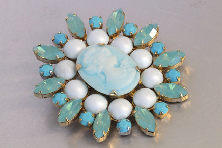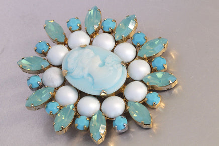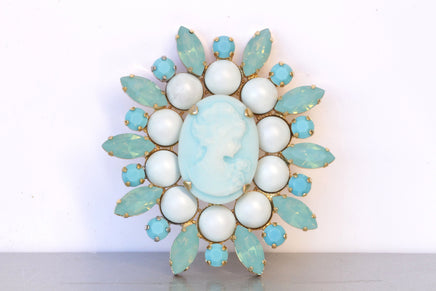 CAMEO BROOCH, Aquamarine Blue Opal Cameo Brooch, Vintage Cameo Brooch, Lady Cameo Brooches, Victorian Style, Light Blue Cameo Statement Pin