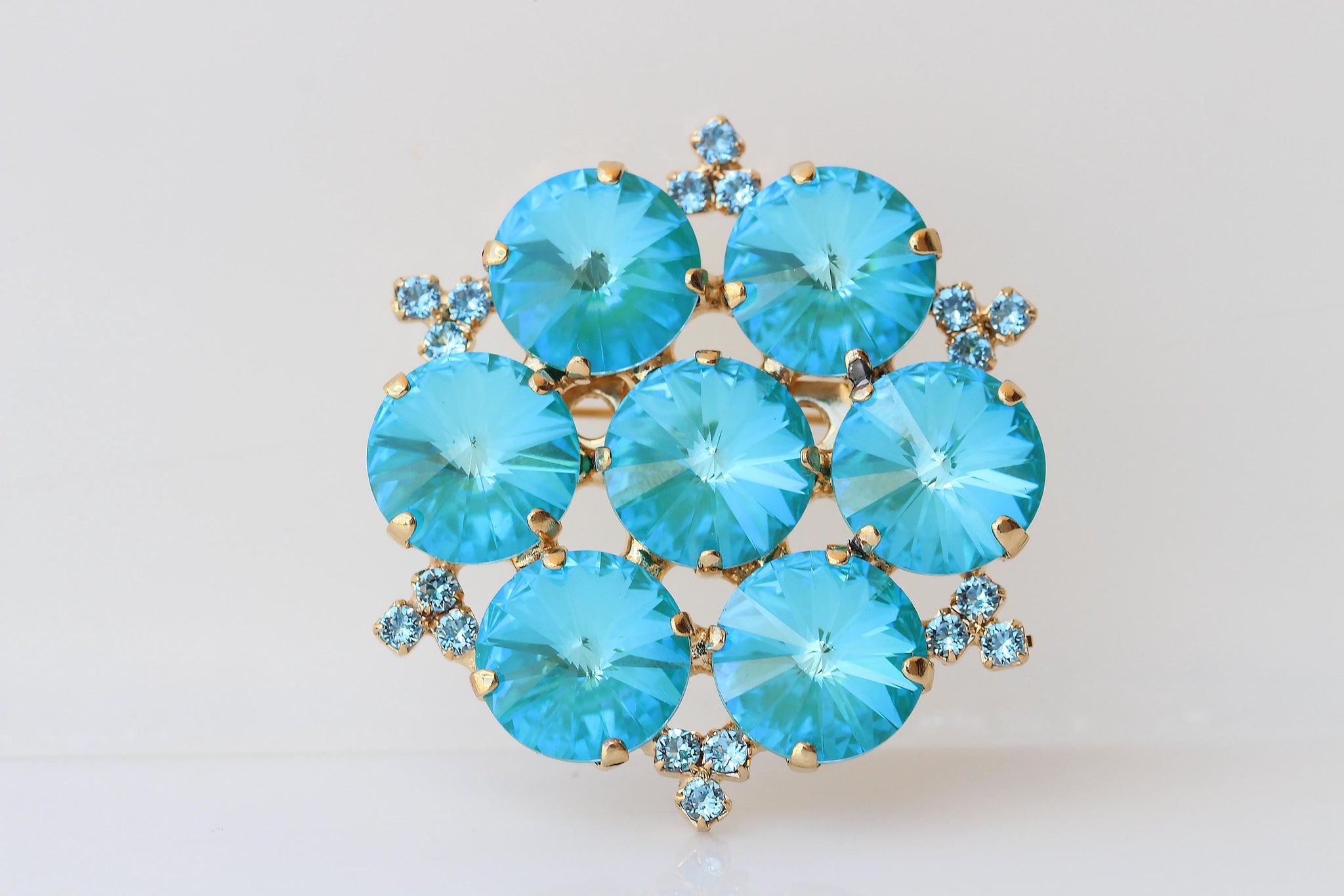 Turquoise Crystals Brooch: Large Statement Flower Brooches, Evening Blue Dress accessories