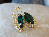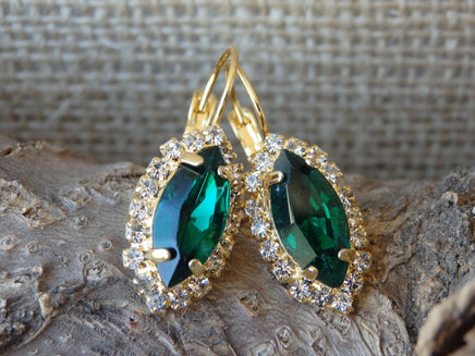Marquise earrings in a Victorian style. These halo earrings have a emerald green stone in the center and clear crystals all around.