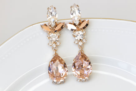 BLUSH BRIDAL EARRINGS,Bridal Morganite Earrings, Rebeka Crystals earrings, Rose gold earrings, chandelier earrings, Vintage Looking,Gift