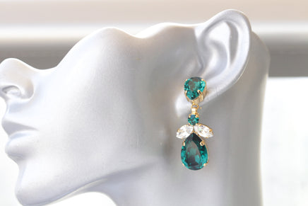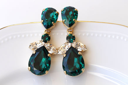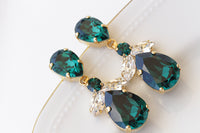 GREEN EMERALD EARRINGS, Evening Long Wedding Earrings, Emerald Crystal Earrings,Jewelry Set For Brides,Statement Dark Green Earrings Gift