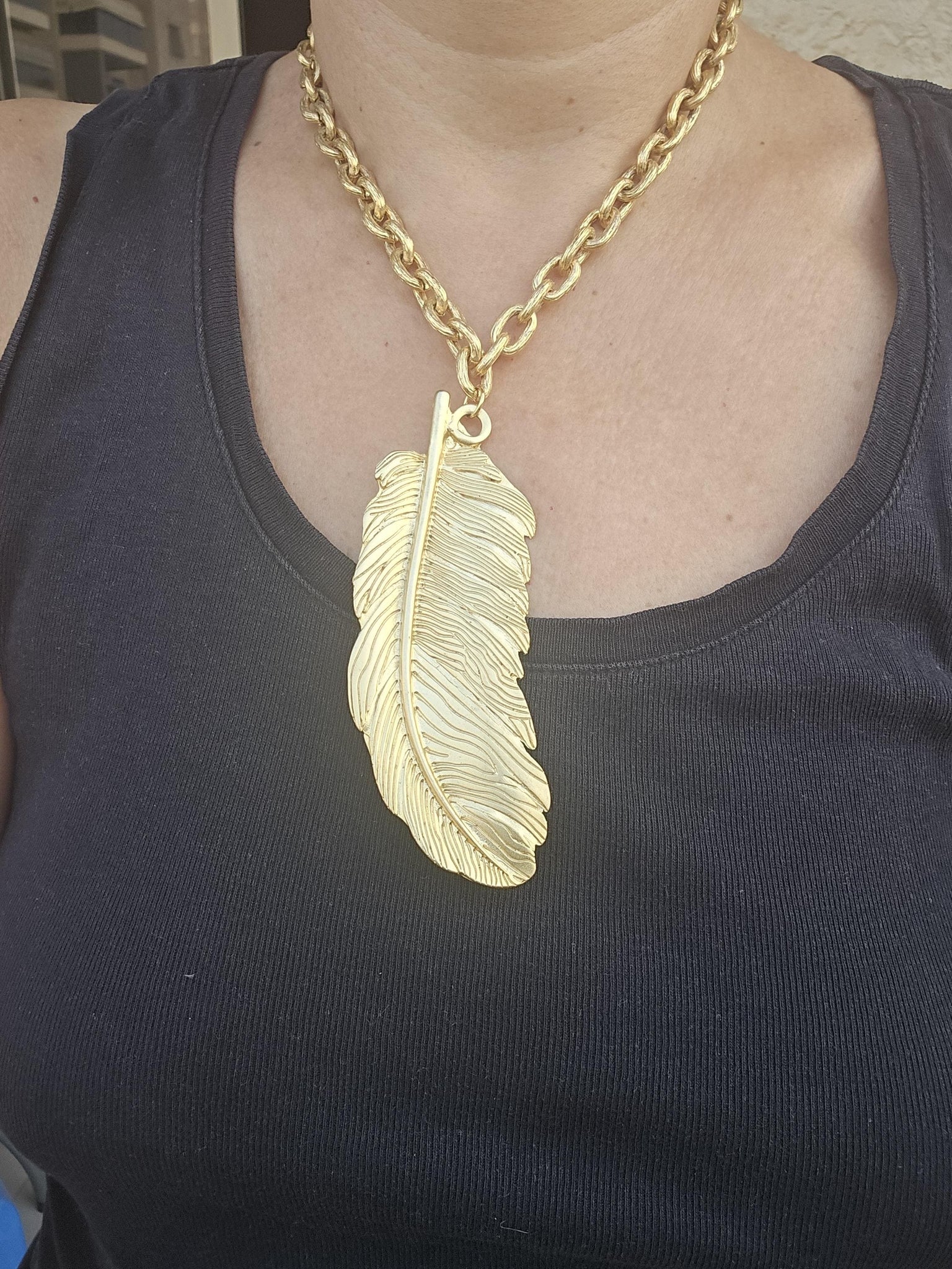 A stunning, large feather pendant paired with a chunky gold necklace—a perfect gift for her. This eye-catching accessory combines elegant design with bold style, making it suitable for both special occasions and everyday wear. The feather pendant adds a touch of nature-inspired charm, while the chunky gold chain offers a timeless, luxurious feel. Give her something unique that she’ll cherish and adore.