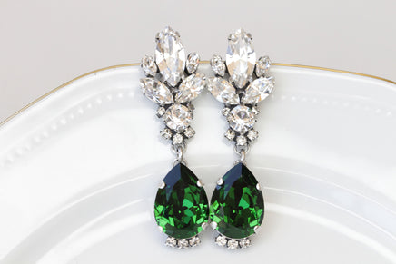 GREEN EARRINGS, Silver Crystal Earrings, Emerald Earrings, Dark Olive Earrings, Bridal Wedding Jewelry,Classic Jewelry, Best Woman Gift Idea
