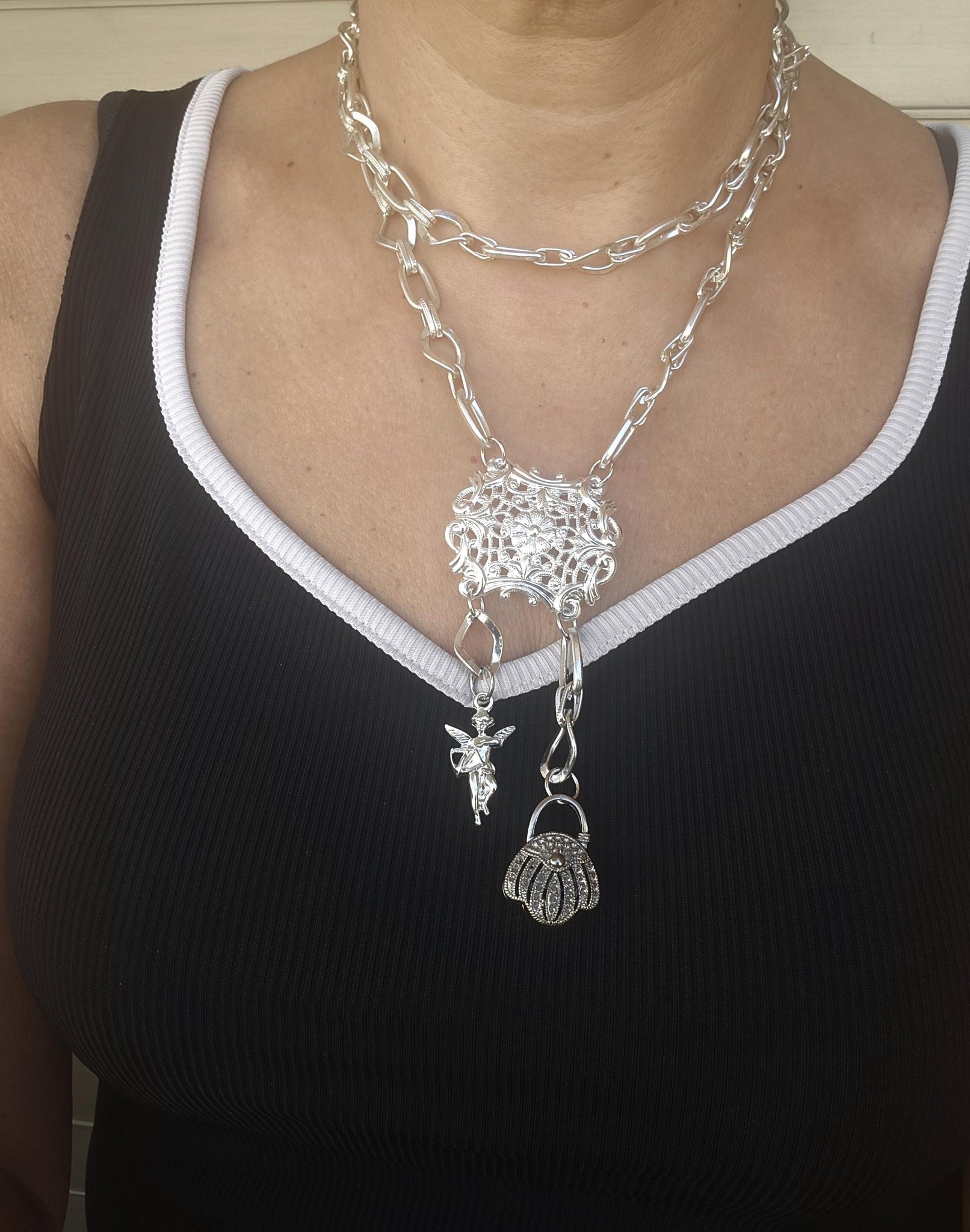 Elevate your style with this stunning multi-charm layered necklace. Featuring a beautifully textured basket charm, an elegant tassel pendant, and a bold chunky link chain, this versatile piece brings together modern trends with classic elegance. The silver-tone finish ensures it complements any outfit, making it perfect for both casual and formal occasions. Wear all layers together for a statement look, or mix and match to suit your mood.