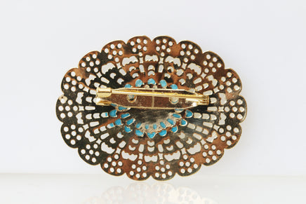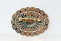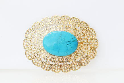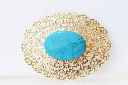 TURQUOISE GOLD BROOCH, Elegante Brooch, Lace Brooch, Large Oval Brooch, Genuine Blue Turquoise Stone Brooch, Safety Pin Brooch, Coat Brooch