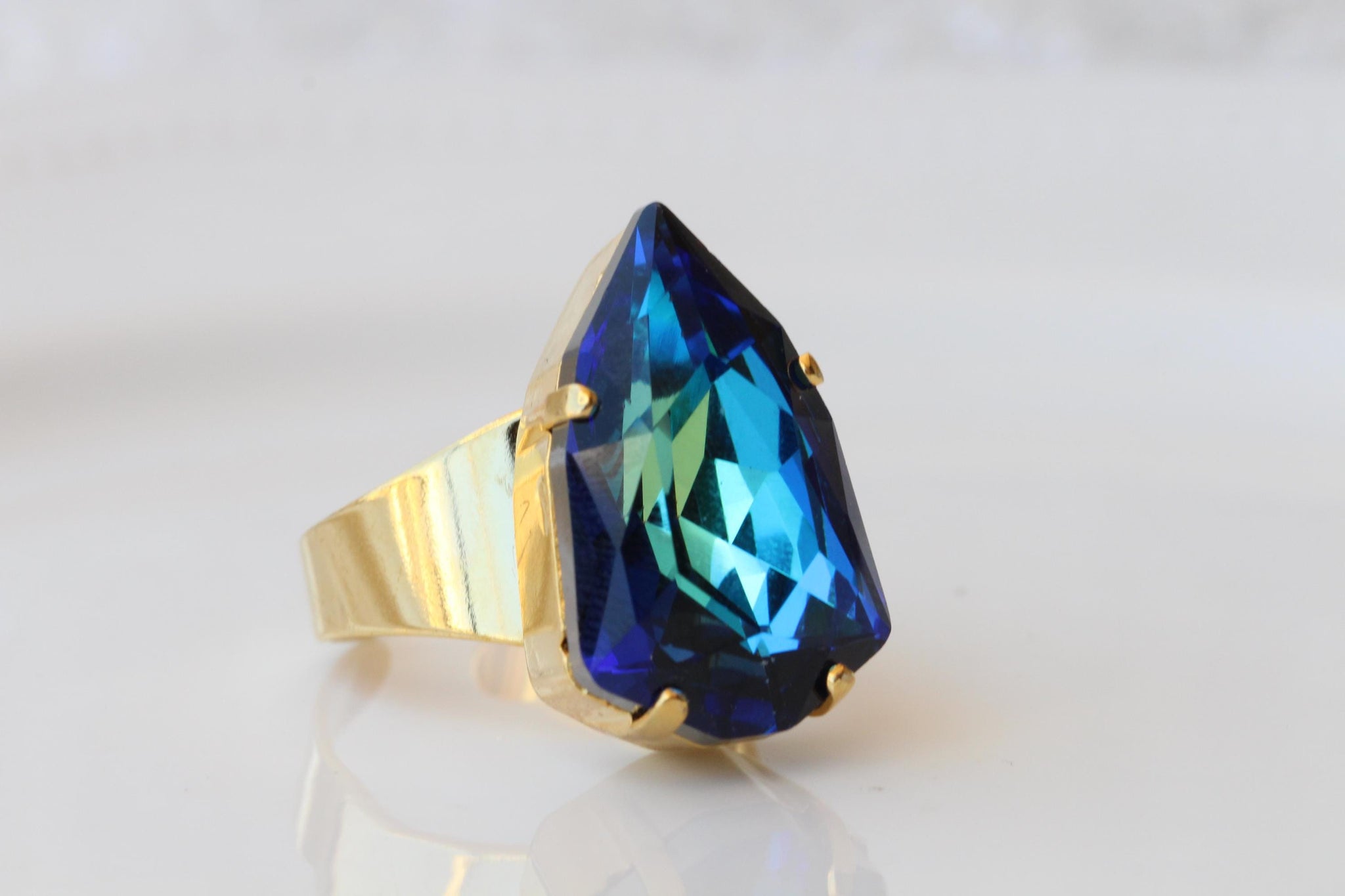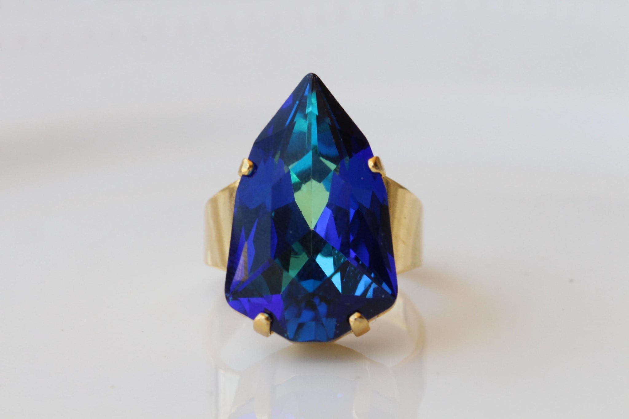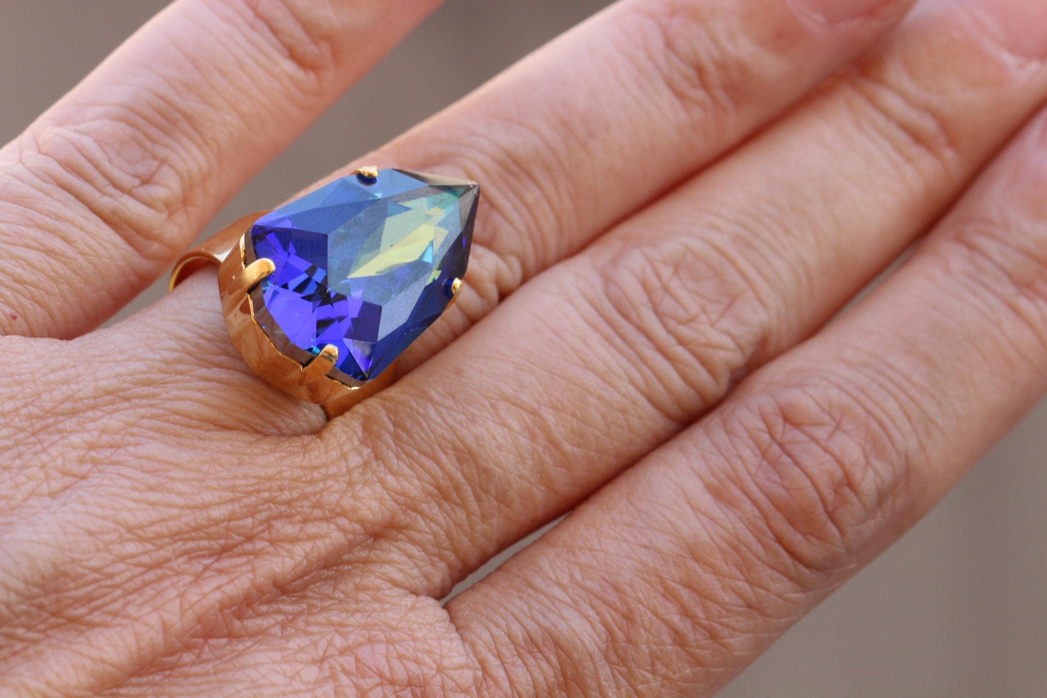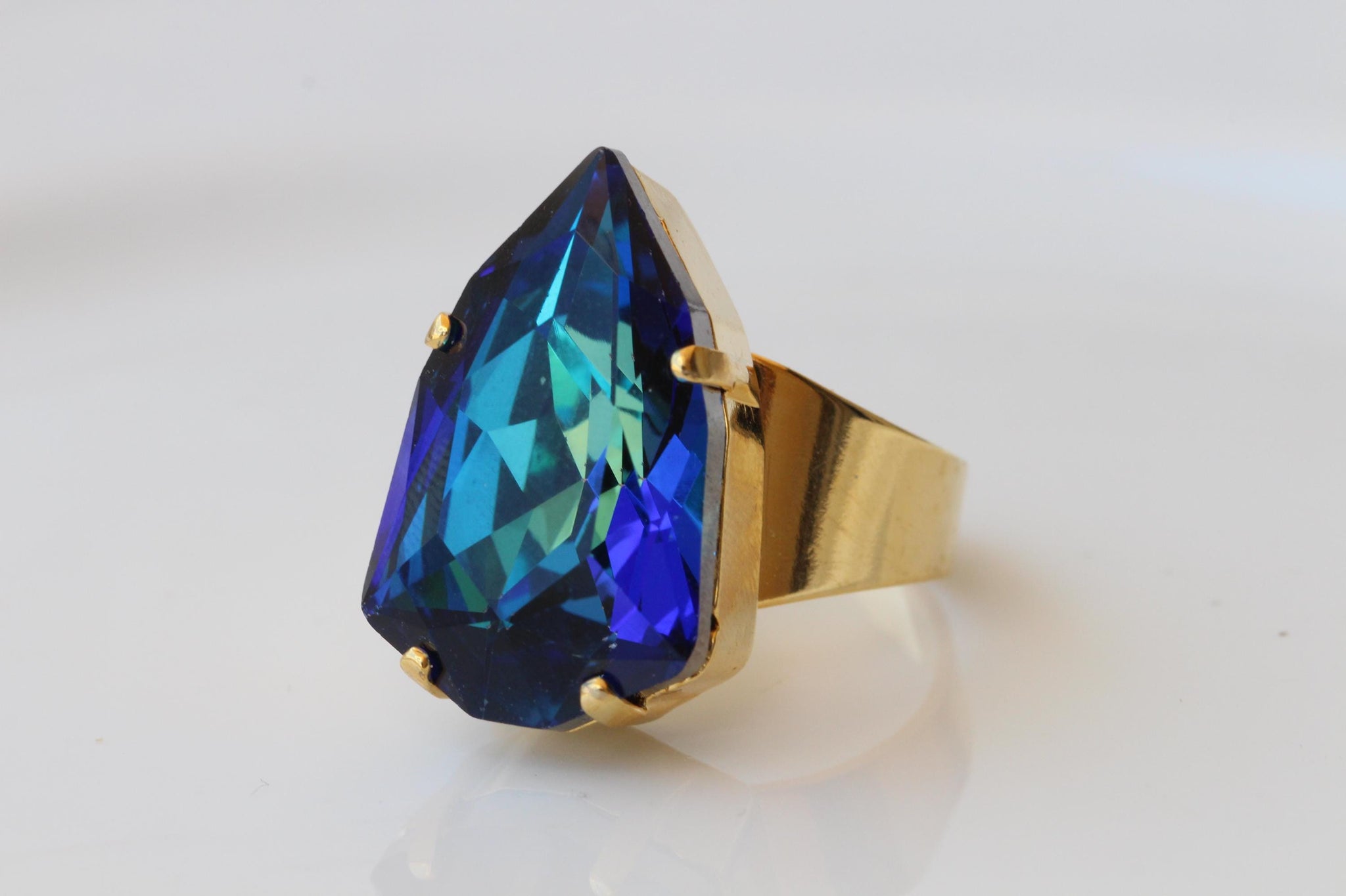 Blue Bermuda Sapphire Crystal Cocktail Ring – Asymmetric Royal Blue Statement Adjustable Jewelry, Big Crystal Fashion Ring for Women