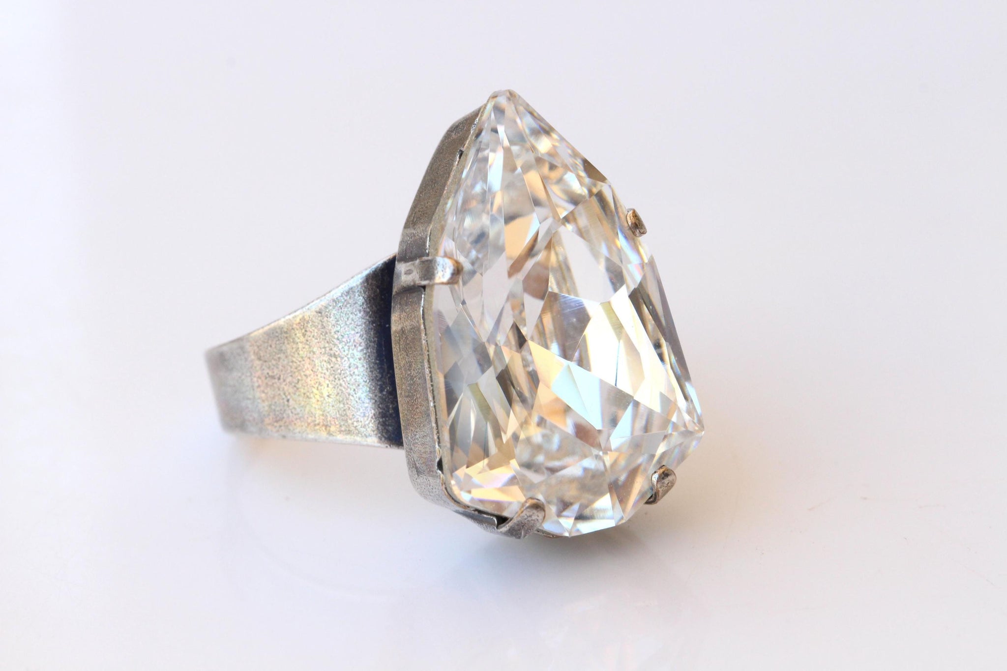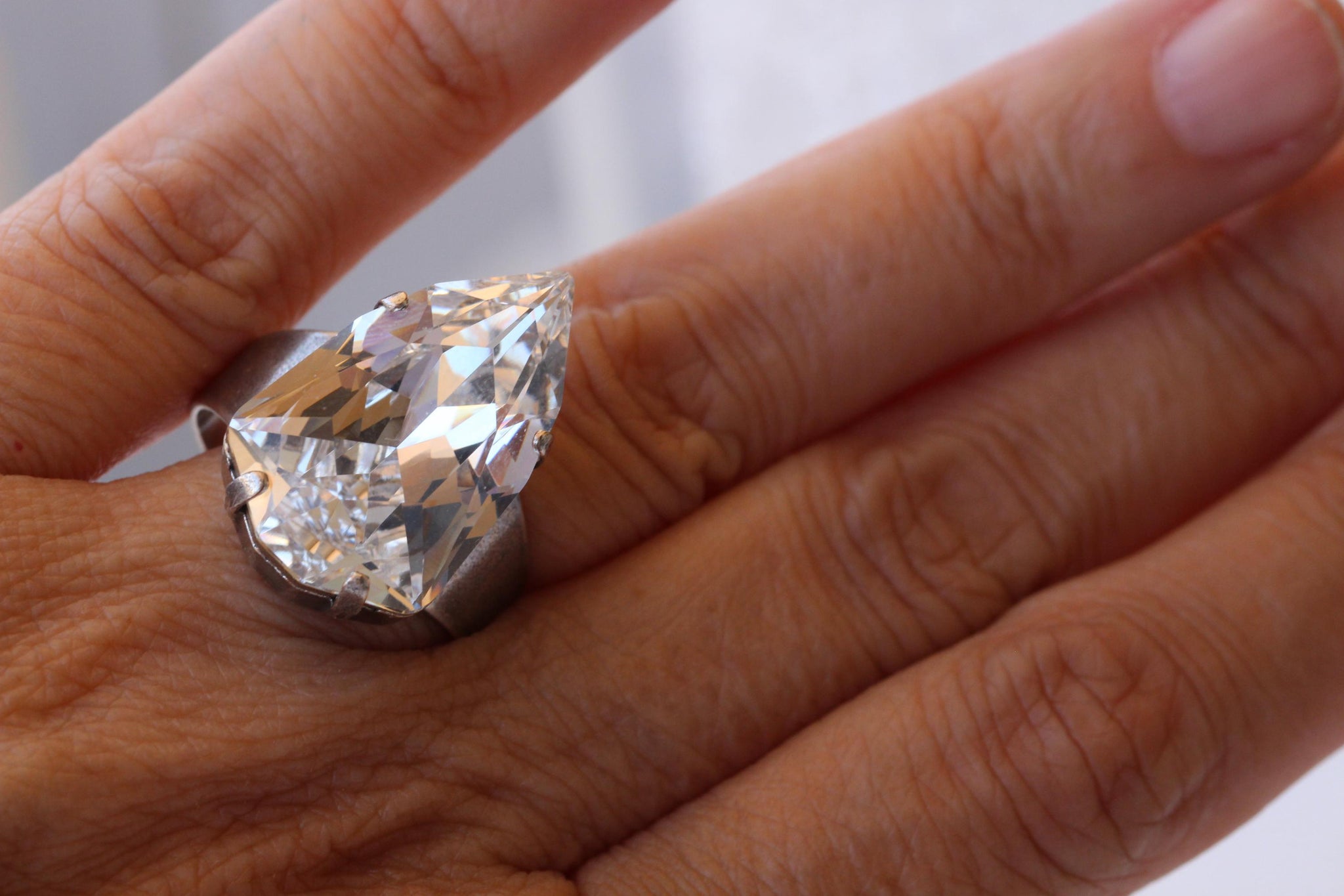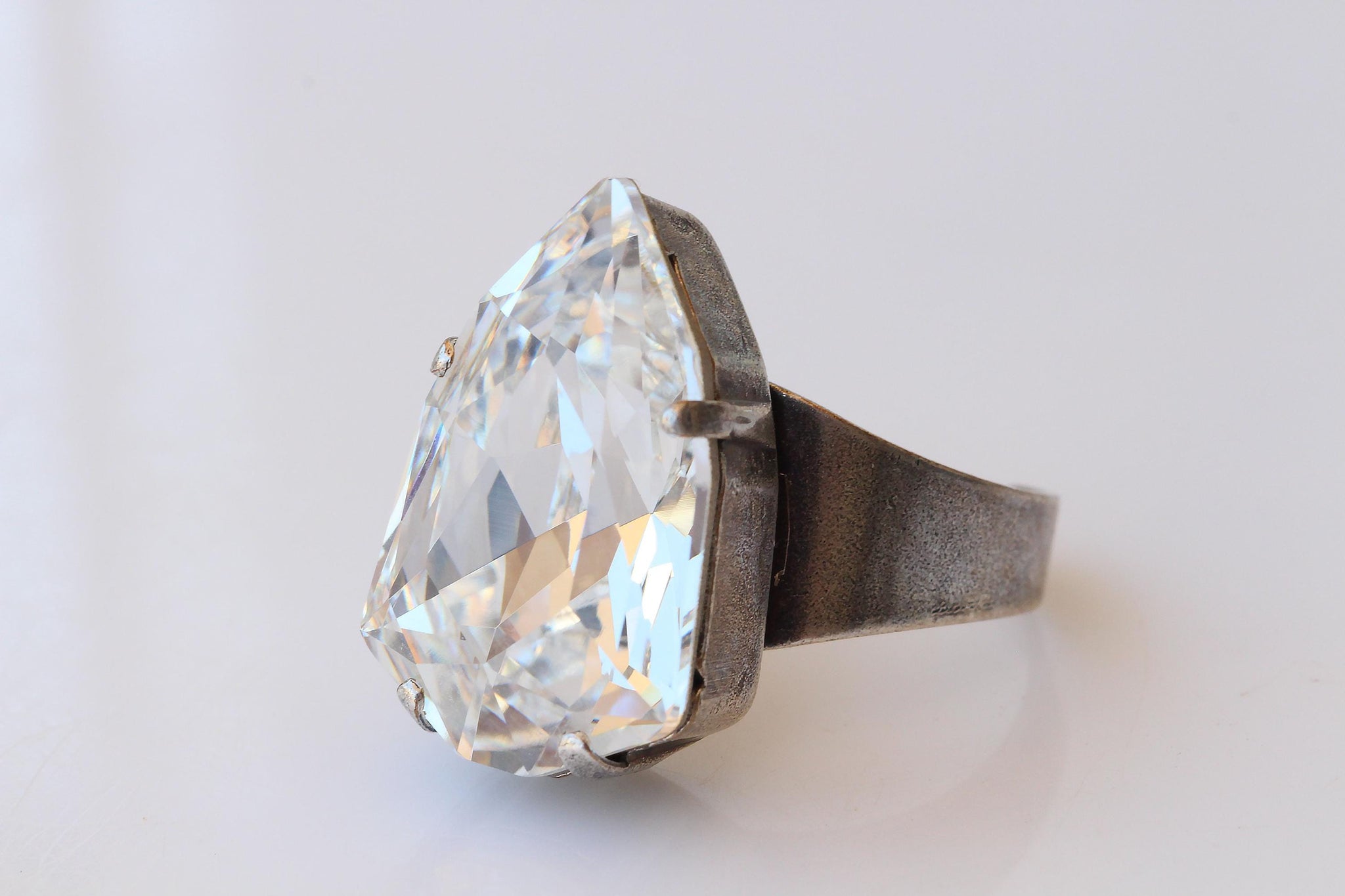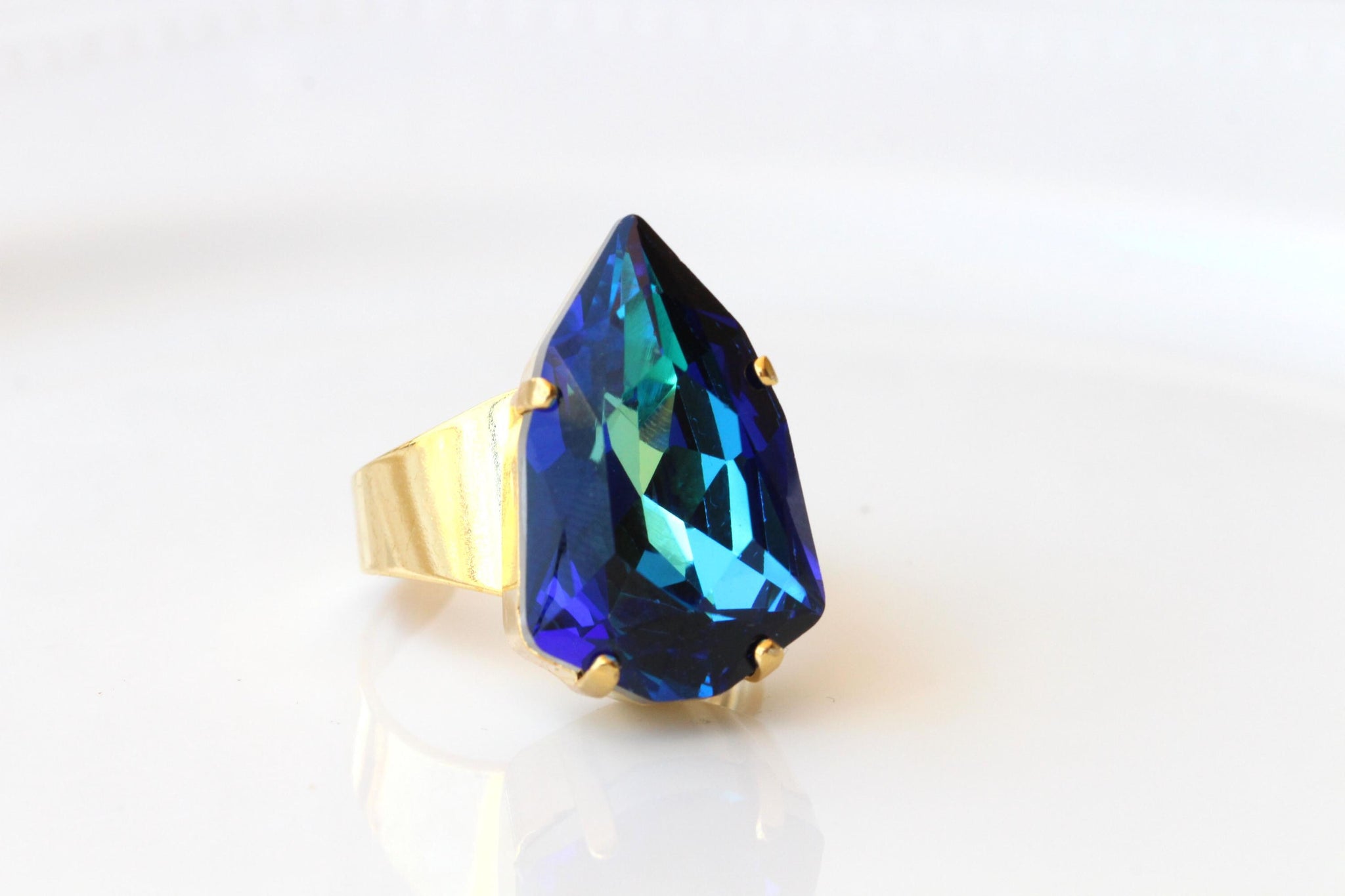 Blue Bermuda Sapphire Crystal Cocktail Ring – Asymmetric Royal Blue Statement Adjustable Jewelry, Big Crystal Fashion Ring for Women