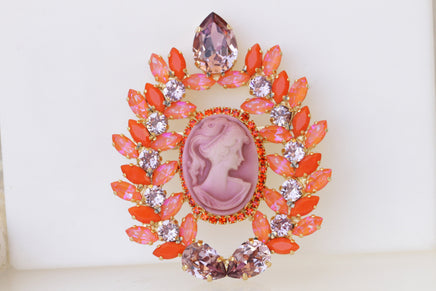 CAMEO BROOCH, Orange Pink Cameo Brooch, Vintage Pink Cameo Brooch, Lady Cameo Brooches, Victorian Style, Antique Pink Cameo Statement Brooch