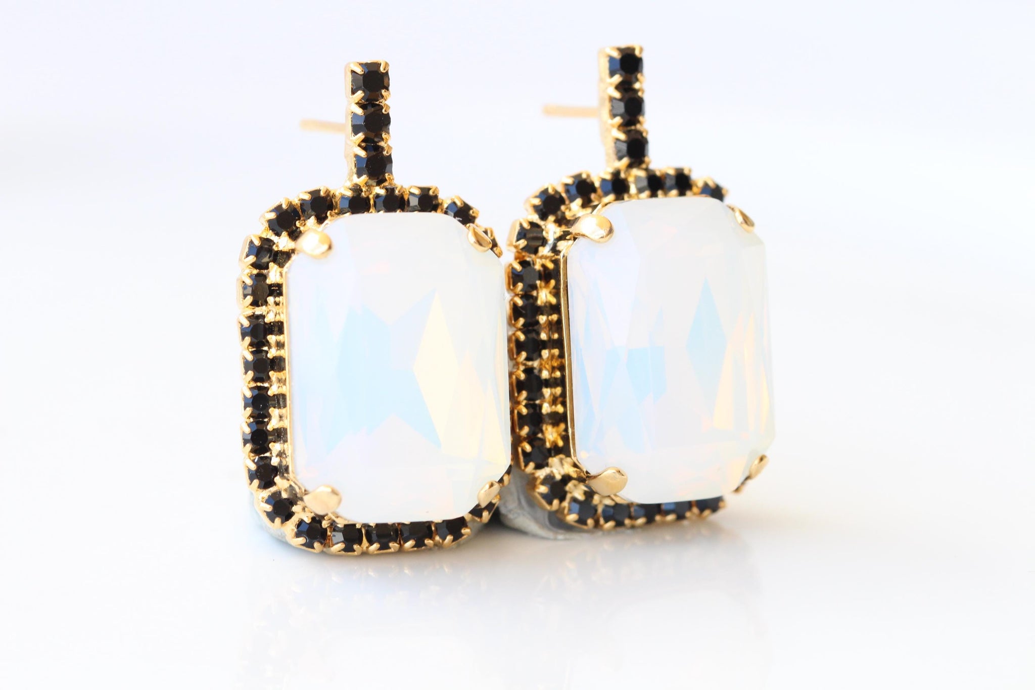 White Opal Crystals Earrings: White And Black Studs, Wedding Bridal Jewelry